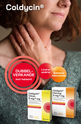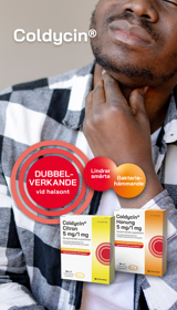 Coldycin är ett receptfritt läkemedel som ger dubbelverkande lindring vid halsont