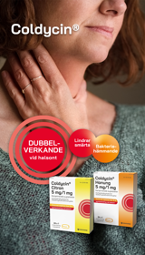Coldycin komprimerade sugtabletter, lindrar halsont via en dubbelverkande effekt – både bakteriehämmande och lokalbedövande. Produkterna kan användas av både vuxna och ungdomar från 12 år.
